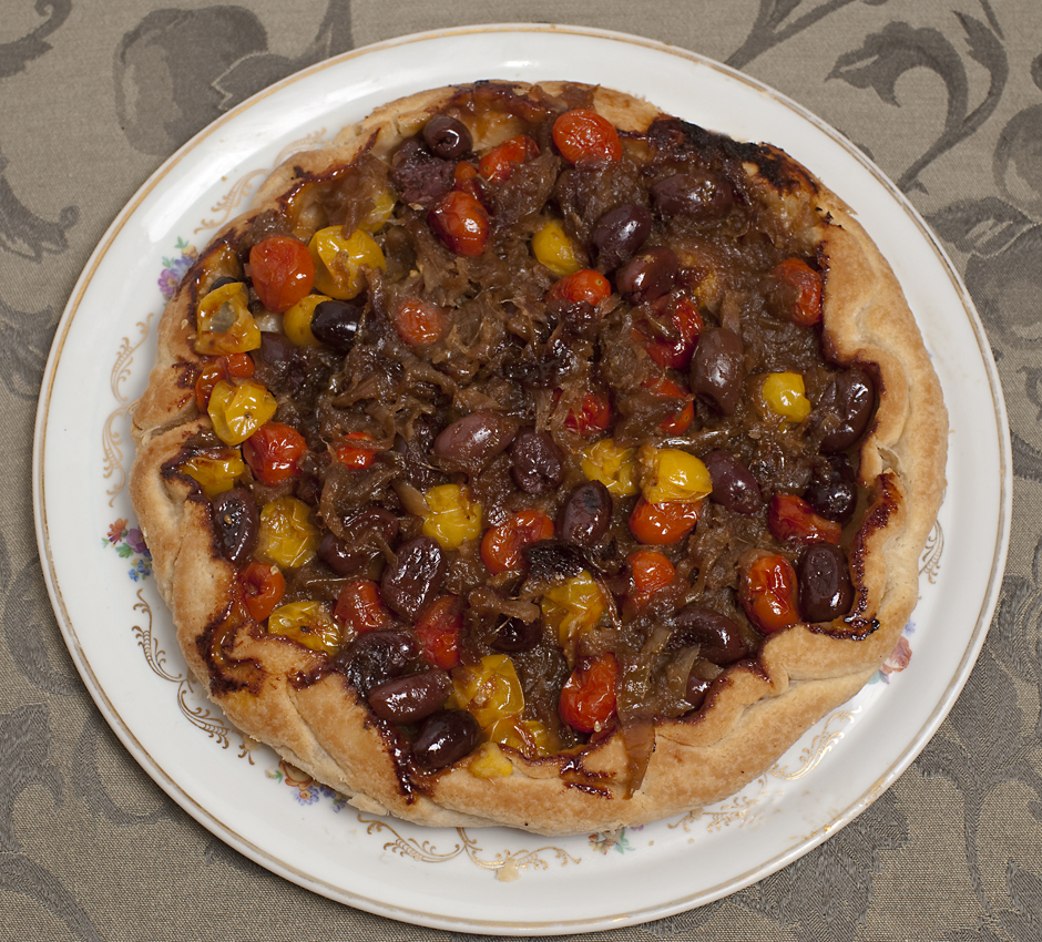 Roll out the pastry dough so that it is slightly greater in diameter than the sauté pan. Roll it up on the pin and lay if over the tomatoes, olives, and onions. Trim the dough around the edge of the pan, and then tuck the edges inside the pan under the tomatoes etc. That will form the crusty edge. Make several small slits in the dough to vent the steam.