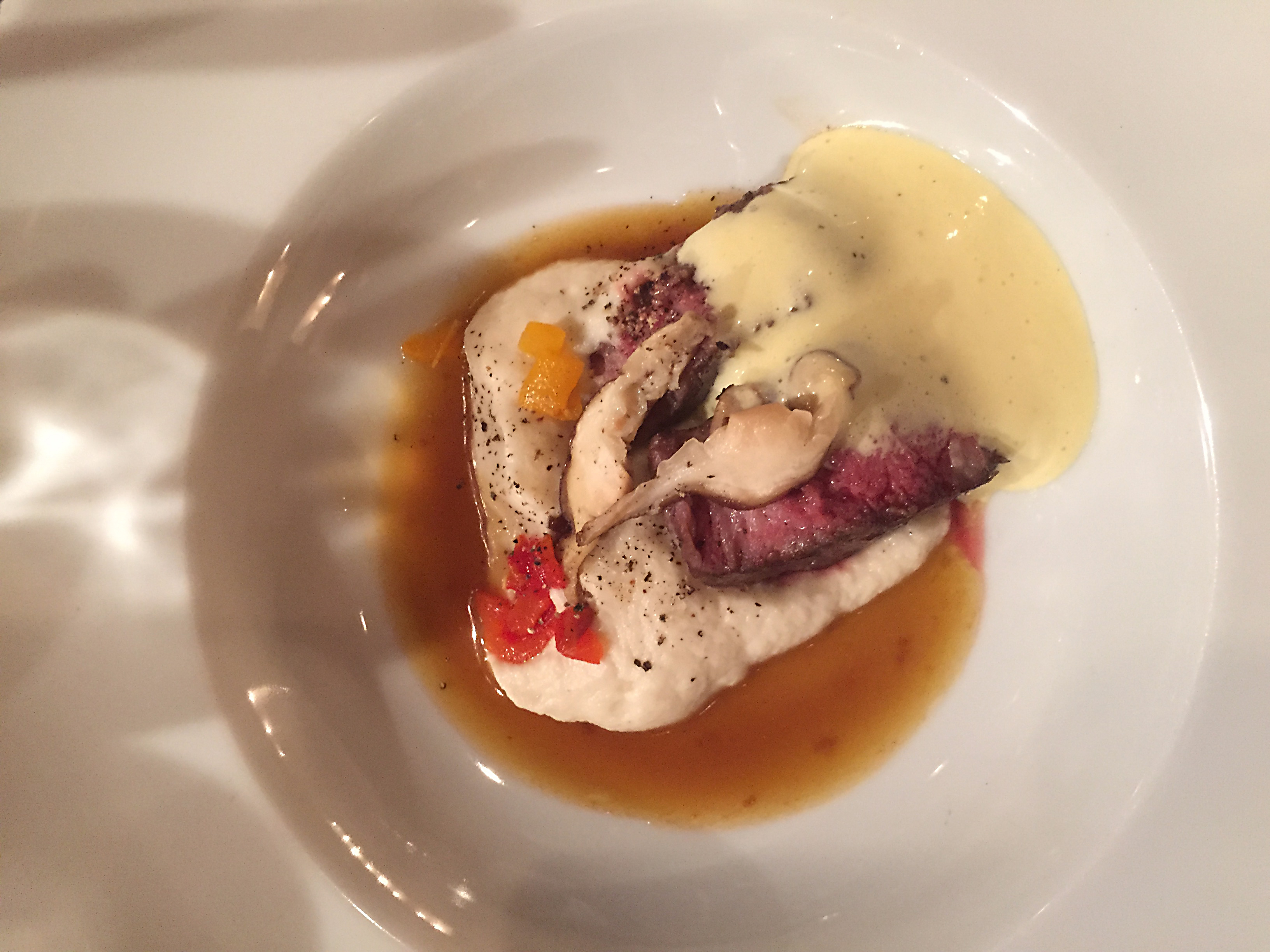 As time goes by, and as more and more meals come out of the 2 GM kitchen, I find that sous vide has become the number one go to method of cooking protein and vegetables. Case in point is the deboned kidney lamb chop over celeriac puree veiled with aerated Hollandaise sauce from a whipper/siphon. And what’s great is that the hollandaise sauce was also sous vide prior to being poured into the whip.