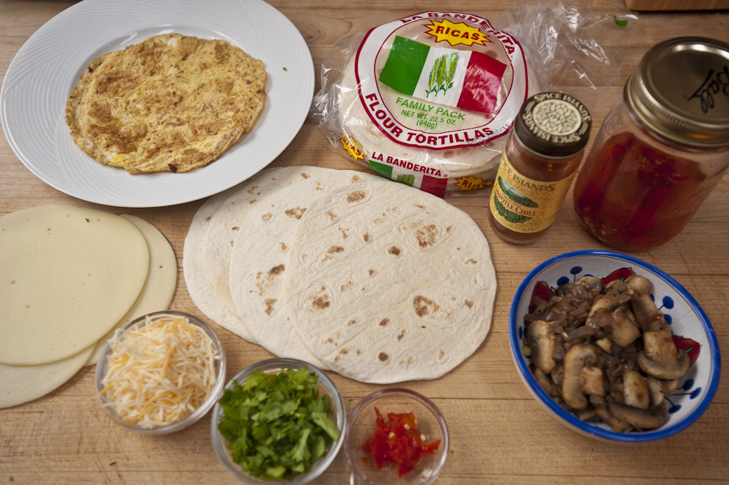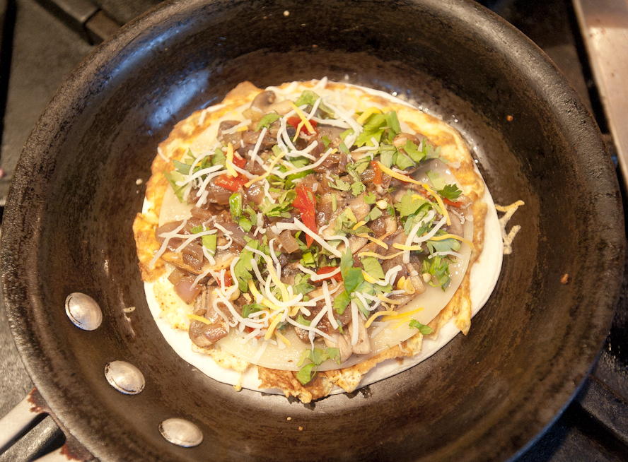 • Place a flour tortilla in the 6” skillet, alternating the toppings: provolone, mushrooms, chilis, shredded cheese, cilantro, and egg crepe. Top with another flour tortilla. Heat gently for 30 seconds per side to brown the tortillas. Transfer to a plate and repeat with the second quesadilla.