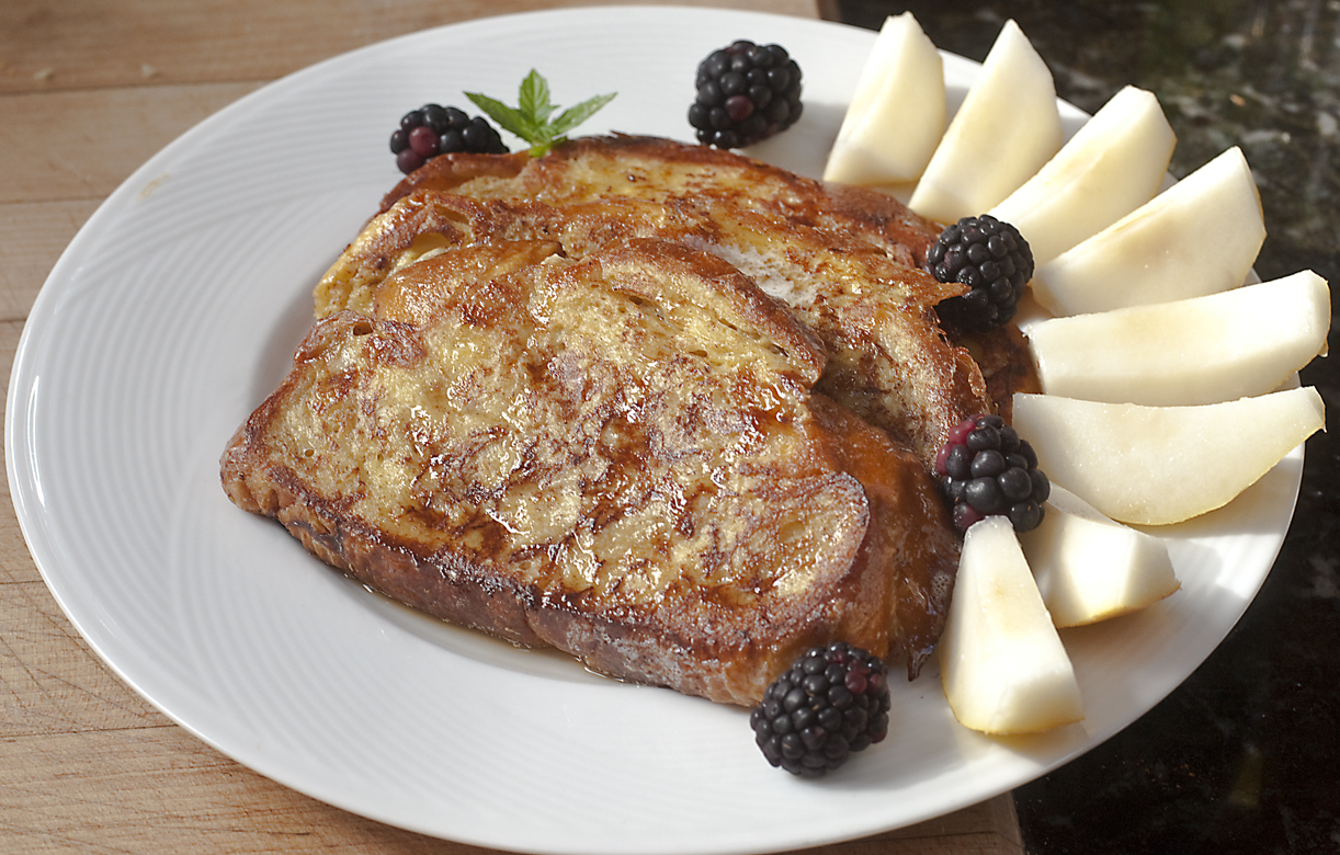 That morning I heard the other gourmaniac hustling around in the freezer looking for breakfast ingredients.  She found a frozen half loaf of challah bread and exclaimed she was making French toast.  A simple undertaking which was made so visually appealing with a sliced pear and several blackberries.
