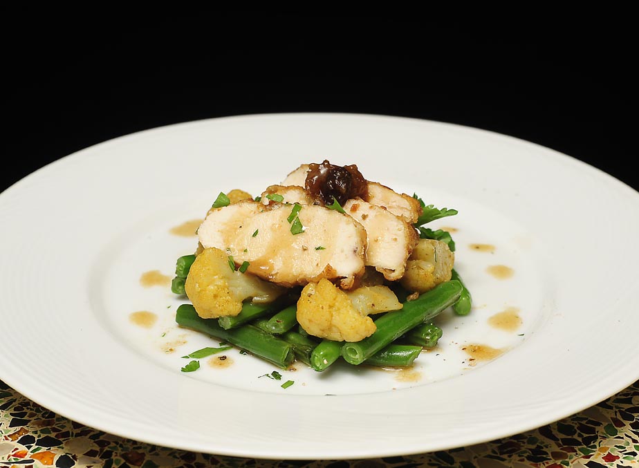 Put two dinner plates in the microwave for 30 seconds to warm. Place some of the green beans in the center of the plates, add a layer of cauliflower on top, then a sliced chicken breast and a dollop of mango chutney on top of the chicken. Spoon some of the reduced sauce over the chicken breast and sprinkle with fresh ground pepper and chopped parsley. Bon appetit!