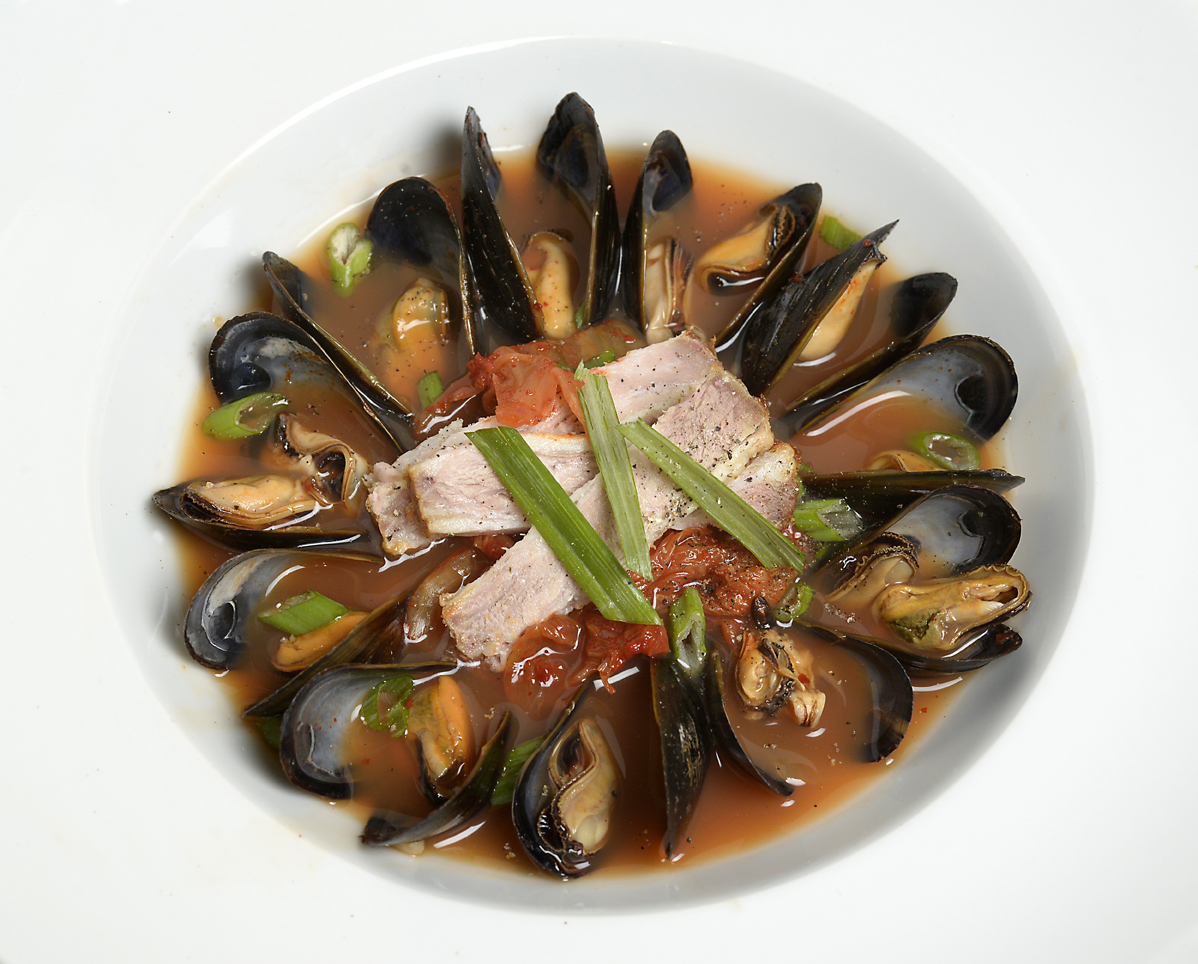 Kimchi Mussels with Pork Belly