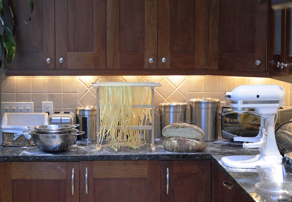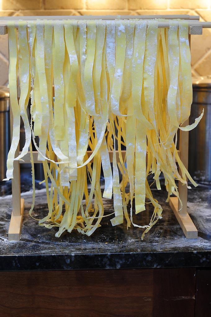 For a long time I used a hand-cranked pasta machine that makes sheets of pasta by passing the dough through consecutively narrower rollers and then cutting the pieces into either angel hair, linguine, or fettuccine widths. About the same time that I changed my pasta dough formula I started using a pasta attachment for my Kitchenaid stand mixer. When I make a lot of pasta the Kitchenaid is a real time saver. From time to time, after I roll out the dough into thin sheets, I put a sheet on a floured surface, flour it, roll it up, and then slice it into 1/2-3/4 inch wide rolls.  Then I unwind each cut piece and hang it on a rack.  I love hand cut pappardelle with their rustic, slightly uneven edges.
