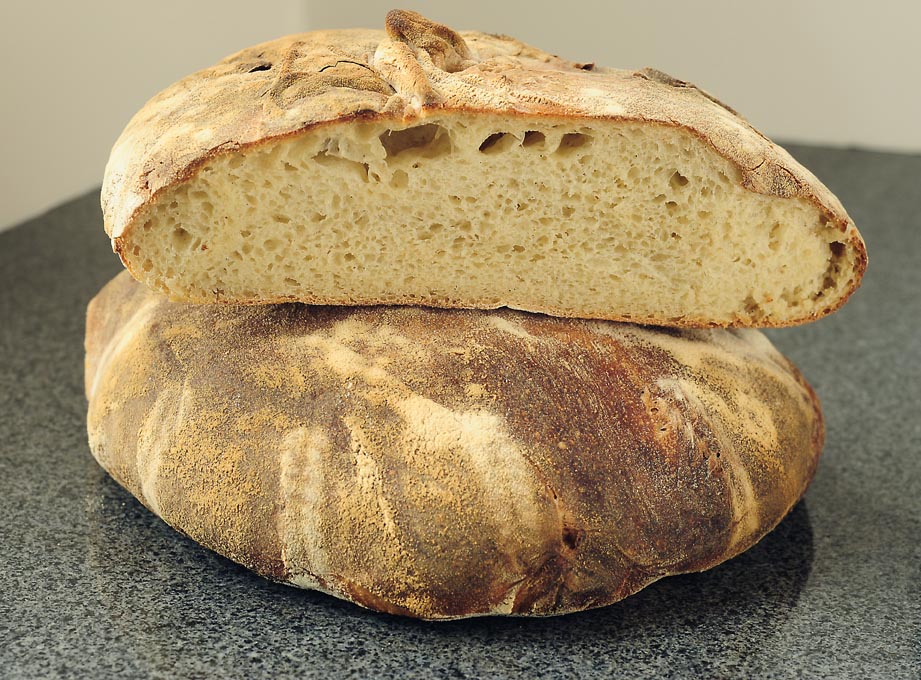 I had a pastry/pasta doubleheader going yesterday. I made two loaves of sourdough bread and a batch of linguine and hand cut pappardelle. My sourdough bread is a two day affair beginning with bringing the starter to room temperature from the refrigerator. Actually, the starter was originally made from capturing yeast culture floating in the air. (For more information on that process I direct you to Rose Levy Rosenbaum’s The Bread Bible.)  The rises for this sourdough are long, real long, and I always end up baking this bread at around 10:30pm.  Last night after the loaves came out of the oven, Rosaria and I carved off a couple of warm slices, poured some olive oil on them, fresh-ground pepper and basil leaves, and wolfed them down. When  I came downstairs this morning, I saw Rosaria had had more than just a slice last night, consequently, that’s why there’s only one-and-a-half loaves to photograph today.