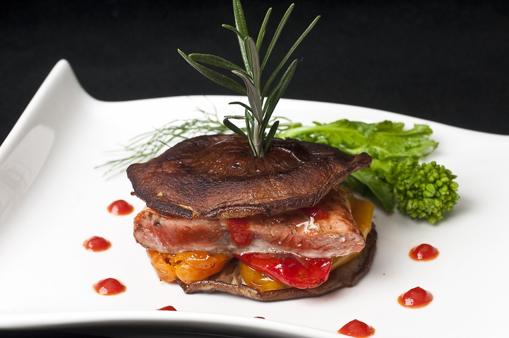 To plate, place a shiitake cap side down at the center of the dish. Add the red, yellow, and orange roasted peppers and top with the salmon filet piece. Give everything a couple of squirts of the Sriracha, and finish by adding the second shiitake on top, completing the sandwich. Spear the sandwich with a rosemary sprig, and squirt a few extra drops of the Srirachi around the plate. Place the broccoli rabe floret near the sandwich, if using, and serve.
