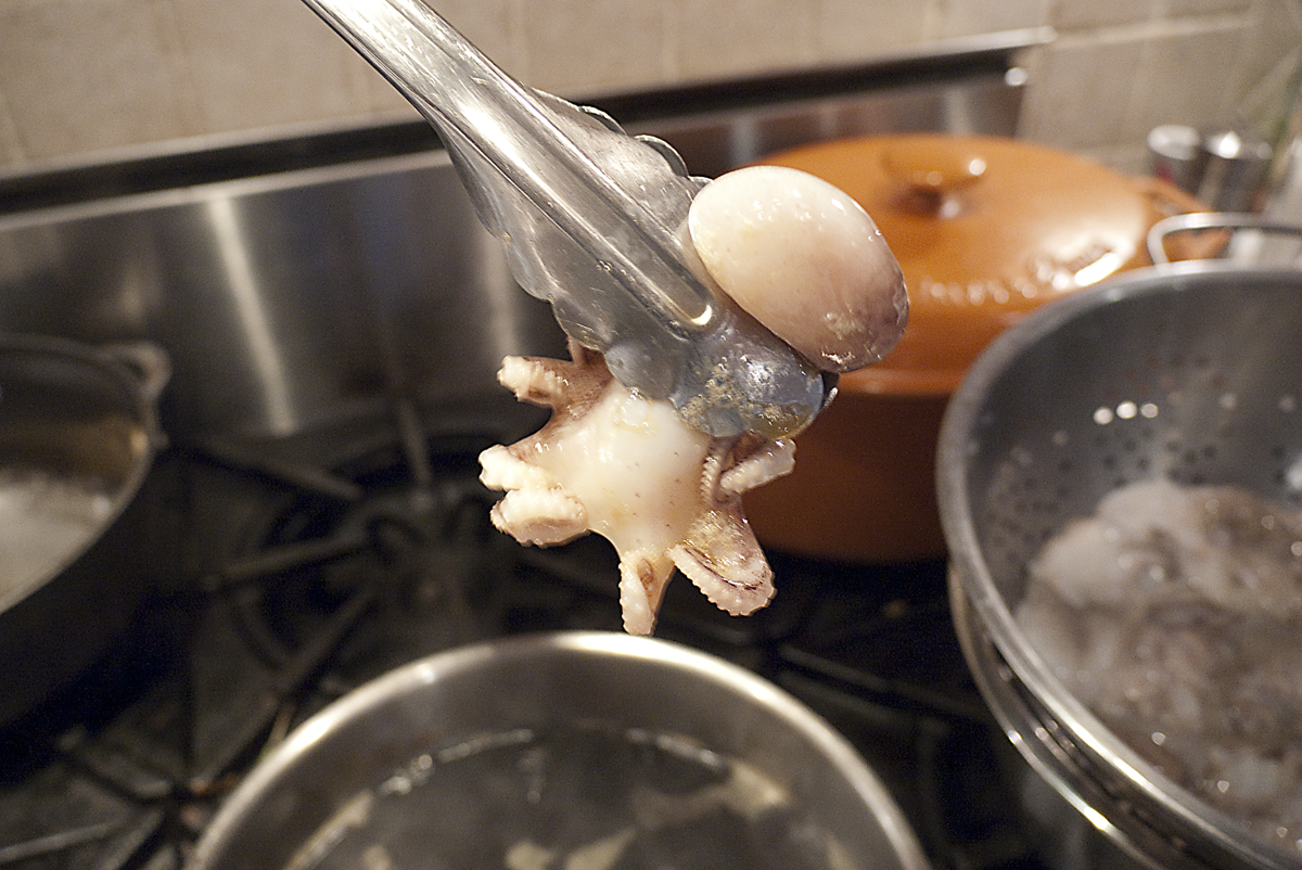 To get into all the menu items for Christmas dinner would be too long for this post so I’m going to focus on the octopuses or octopi, if you prefer. Now at 2Gourmaniacs we’ve had a lot of trials and tribulations with octopus: the challenge is how to render an octopus that is tender, flavorful, and definitely not rubbery or overly chewy. There are two schools of thought on how cook a tender octopus. The first is to bash the creature to smithereens and quickly boil it for several minutes. Althoug I’ve always enjoyed the bashing part, I’ve never had much luck with a quick boiling to produce a tender octopus. Hence the second school of thought. Omit the bashing (darn) and slow cook the cephalopod either in water or in a slow oven or a combination of both. (Years ago, one afternoon when my son, Alex, came home from school he wanted to know if that was an octopus in the sink and, if so, why I was rubbing  it. Good question Alex! The Japanese recommend massaging octopus with grated daikon to remove the skin and to tenderize it. It works well in removing the skin, but after massaging and boiling it, I couldn’t find any real measure of increased tenderness.)