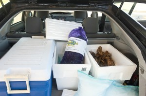 Additionally, the other Gourmaniac insisted on a couple of 2-lb hard shell Maine lobsters. Did you know that if you purchase soft shell lobsters, you will need to cook them within 4 hours of leaving the lobster tank, whereas the hard shell ones can survive 12-24 hours if packed on seaweed and ice packs? So off we went, with a trunk loaded to the gills with fish, and I thought: how about sous vide lobster?