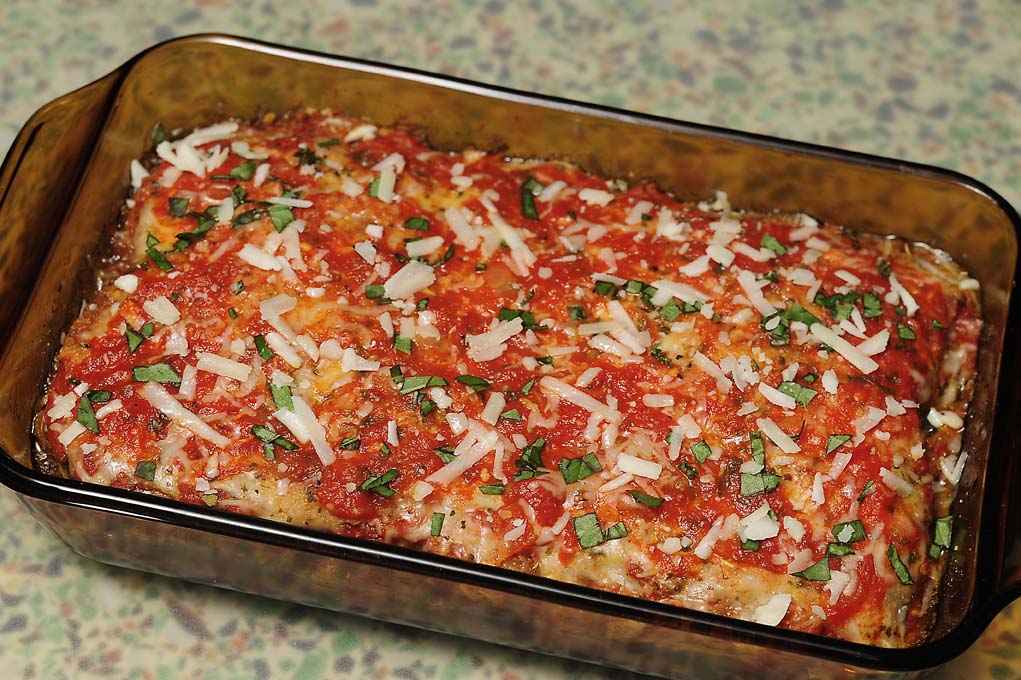 Pour a thin layer of the tomato sauce at the bottom of a medium oven proof dish (see above picture) and arrange the first few eggplant slices in the dish, topping with the shredded mozzarella, plus the provolone / parmigiano combination, and cover with tomato sauce. Repeat by adding the remaining eggplant slices and forming a second and final layer. Top with the remaining cheese mixture and sauce, but set aside at least 1/4 cup of the tomato sauce for serving. Cover dish with aluminum foil and place in the oven for 45 minutes. Test for eggplant tenderness with a knife and, if ready, remove dish from oven and let cool for 5 minutes. Top with the reserved tomato sauce, the pecorino / parmigiano cheeses and the chopped basil.  Using a metal spatula, cut into desired portions and place in dishes. Serves 4-6, depending upon your appetito.