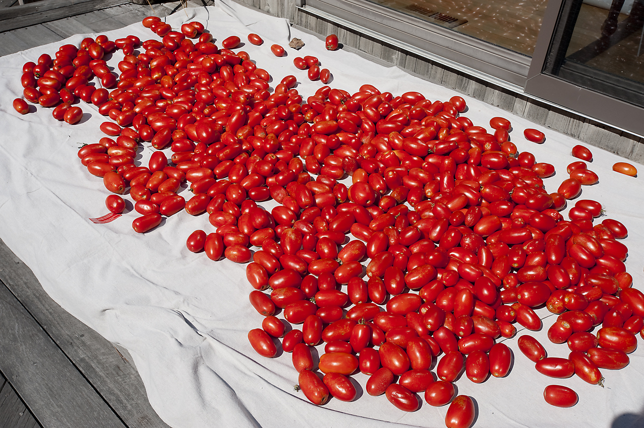 As I said earlier, I was a little strange making sauce by myself this year. After picking six bushels of tomatoes, I brought them home and spread them out on my back deck for several days to finish ripening. red_tomatoes ripeningThis year I picked 3 bushels of red plums, 2 bushels of orange plums, and a bushel of yellows. I also picked about a half a bushel of red grape tomatoes which made the best and sweetest sauce of all the tomatoes.